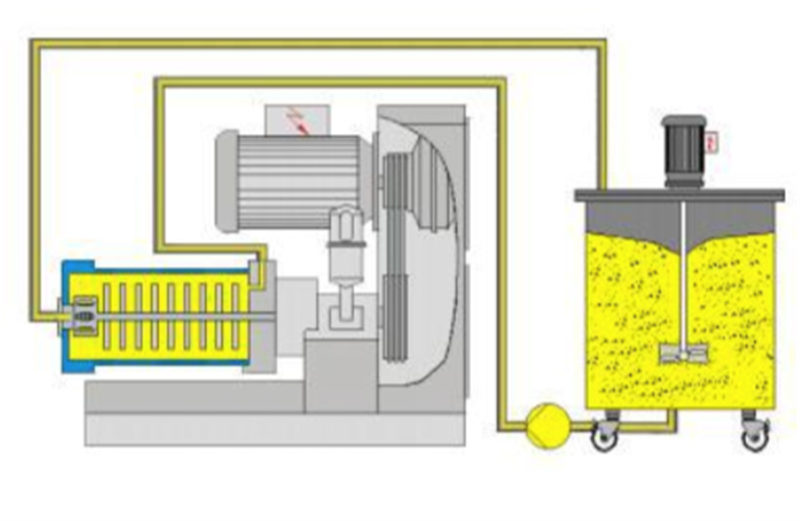 采用循環(huán)研磨工藝,環(huán)保節(jié)能、勞動強度小。配制好的原始漿料,經(jīng)過第一遍粗略研磨后,泵入循環(huán)攪拌罐,經(jīng)底部泵輸送進(jìn)入納米研磨機;一邊經(jīng)過研磨后送入循環(huán)罐,與未曾研磨過的物料通過攪拌機快速混亂,一邊又通過底部泵入砂磨機,周而復(fù)始直到達(dá)成研磨要求。一般而言,罐的容積是砂磨機流量的1/4。采用循環(huán)研磨工藝或多次研磨工藝能使產(chǎn)能提高,產(chǎn)品顆粒級配分布得以優(yōu)化。稍加一些控制功能,可保證產(chǎn)品的可復(fù)制性及節(jié)省成本。大尺寸轉(zhuǎn)子加上筒狀縫隙式分離器,使該型設(shè)備可使用不同材質(zhì)小顆粒珠子。對于防金屬污染的物料,可采用陶瓷(碳氮化硅,氧化鋯)及聚氨酯結(jié)構(gòu)材料。