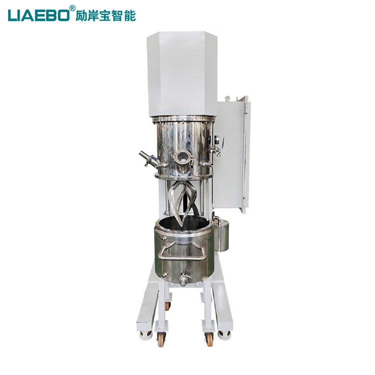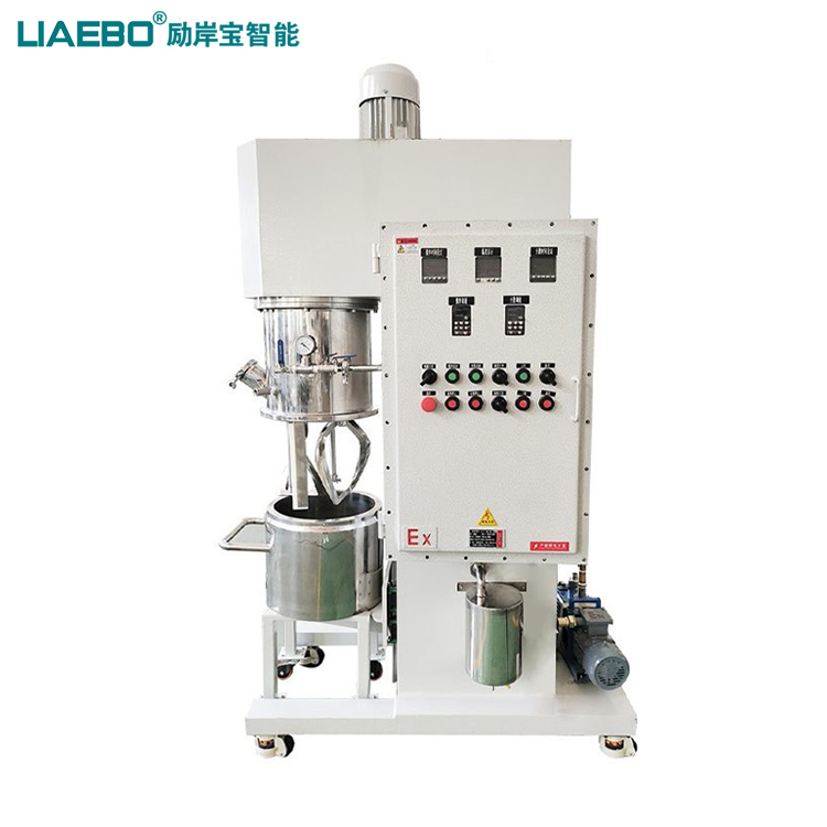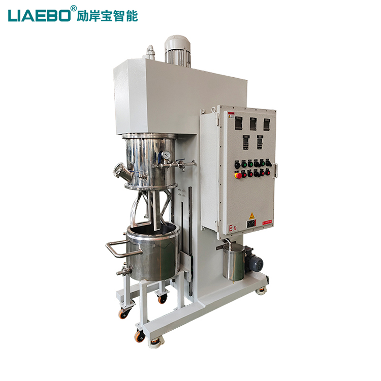 雙行星真空攪拌機(jī)是一種高性能、高效率、易清洗維護(hù)的新型攪拌設(shè)備。主要由減速電機(jī)、行星架、攪拌器、分散器、刮壁器、料桶、升降系統(tǒng)、液壓擠出系統(tǒng)以及機(jī)架等構(gòu)成,設(shè)備的雙組攪拌器運(yùn)行時(shí)自轉(zhuǎn)同時(shí)繞著軸心進(jìn)行公轉(zhuǎn),攪拌器形式根據(jù)物料粘度和工藝特性選配,常見的包括漿葉式、麻花式、爪式、框式等,具備良好的混合、反應(yīng)、捏合、溶解的作用;高速分散器由多層具備極高線速度的鋸齒狀分散盤組成,它同樣在高速自轉(zhuǎn)的同時(shí)繞著軸心進(jìn)行公轉(zhuǎn),能夠?qū)⒎哿?助劑)快速的分散到漿料里,具備很強(qiáng)的分散作用。設(shè)備配有一組獨(dú)立刮刀,對(duì)桶壁進(jìn)行不斷的刮拭,同時(shí)攪拌漿葉可以增加刮片,對(duì)料桶底部進(jìn)行刮拭,避免攪拌死角,確保產(chǎn)品的穩(wěn)定性;雙行星真空攪拌機(jī)傳動(dòng)采用行星齒輪傳動(dòng),有較大的輸出扭矩,適用干高溫、高固,高粘度等高難度工況;該設(shè)備采用密閉式設(shè)計(jì),可以配合真空系統(tǒng),實(shí)現(xiàn)真空攪拌,攪拌桶也可設(shè)計(jì)帶夾套加熱,配合模溫機(jī),實(shí)現(xiàn)恒溫?cái)嚢韫δ埽鞘袌?chǎng)上針對(duì)高粘度物料的分散、攪拌設(shè)備。